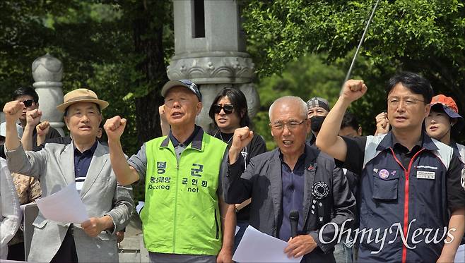 김율현 대전민중의힘 상임대표도 "우리는 과거를 청산하지 못해 아직도 친일 반민족, 반민주행위자들, 민주주의를 탄압하고 민간인을 학살한 자들이 이곳 대전현충원에 묻혀 있는 부끄러운 역사를 매년 마주하고 있다"며 "역사를 왜곡하고 친일 역사 쿠데타를 자행하는 자들이 권좌에 오를 수 있었던 것은 우리들이 이 부끄러운 역사를 온전히 단죄하지 못했기 때문이다. 이제 더 이상은 안된다. 국립묘지법 개정으로 왜곡된 역사를 바로잡는 첫걸음을 떼야 한다"고 강조했다.