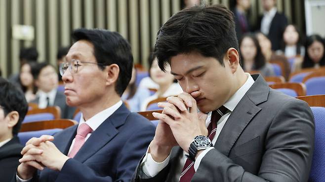 ▲ 국민의힘 김용태 비상대책위원장이 5일 서울 여의도 국회에서 열린 의원총회에서 생각에 잠겨 있다.