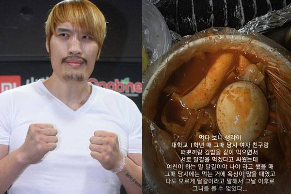 6일 최홍만은 한 컷의 떡볶이 사진과 함께 "먹다 보니 생각이 난다"며 대학 시절 여자친구와 떡볶이와 김밥을 함께 먹던 일을 회상했다.