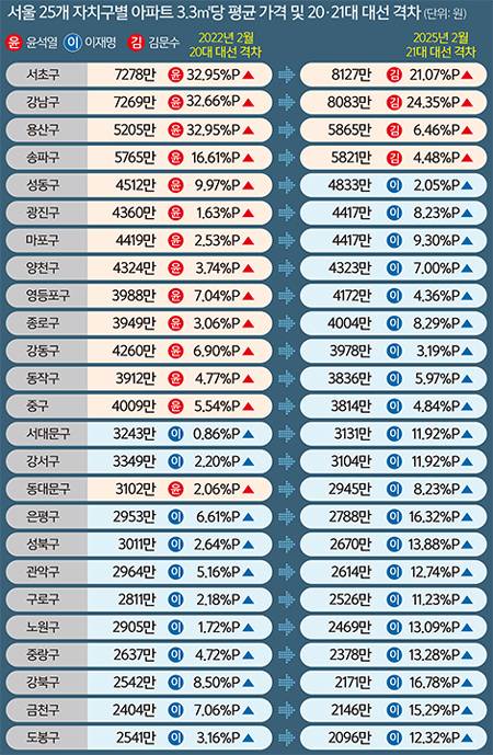 서울 민심의 변화는 ‘강북’의 변화에서 도드라진다. 이 대통령은 성동을 포함해 광진 48.09%, 마포 48.41%등 문재인 정부에서 아파트가격 상승을 주도했던 한강벨트 강북 권역 중 용산을 제외하고 승리했다. 3년 전에서는 윤 전 대통령이 승리한 지역이었다.