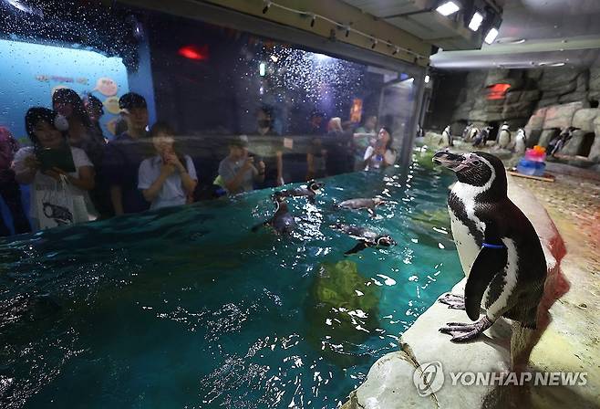 (서울=연합뉴스) 김도훈 기자 = 6일 서울 강남구 코엑스 아쿠아리움에서 막내 훔볼트 펭귄인 풀청이(2022년생)가 관람객들을 바라보고 있다.