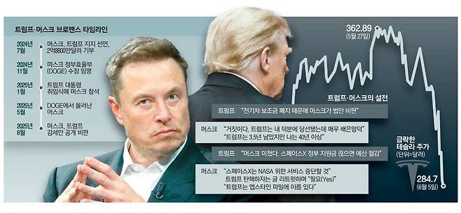 한때 최고의 '브로맨스'를 자랑하던 도널드 트럼프 미국 대통령과 일론 머스크 테슬라 최고경영자(CEO) 간 관계가 서로에 대한 원색적인 비난과 함께 파국을 맞았다. 트럼프 행정부의 대규모 감세안이 담긴 '하나의 크고 아름다운 법안(BBB·The One Big Beautiful Bill)'에 대한 머스크 CEO의 계속된 비판에 트럼프 대통령이 반응하면서 두 사람은 돌아올 수 없는 강을 건넌 모습이다.