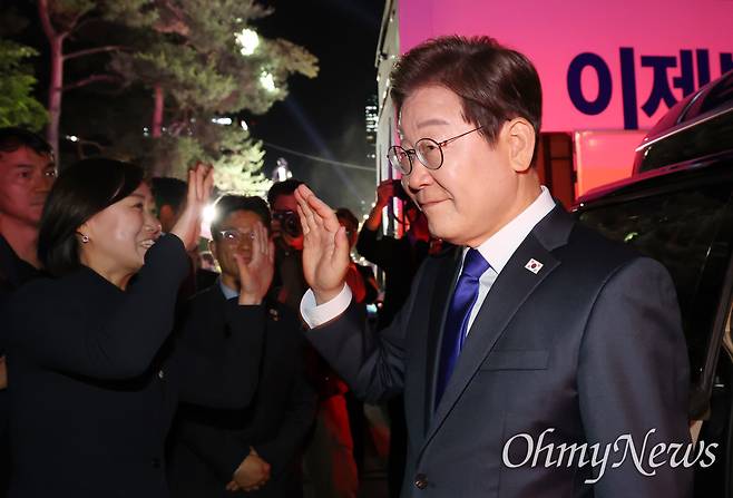 | ▲ 제21대 대통령에 당선된 이재명 당선인이 4일 여의도 국회앞에서 국민개표방송을 마치고 의원들과 하이파이브를 하고 있다. |