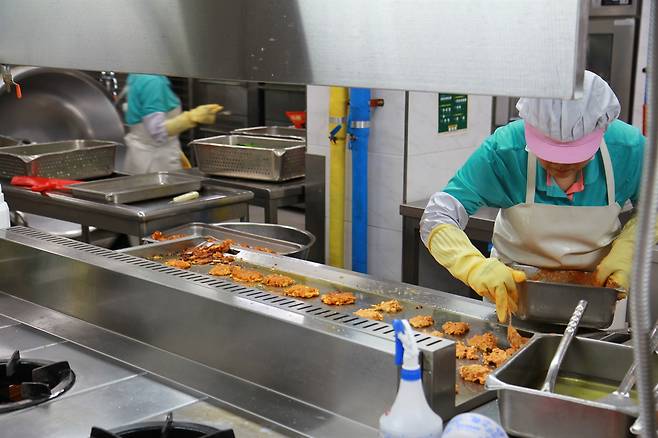 | ▲ 지난 5월 26일, 서울의 한 중학교 급식조리사가 김치전을 직접 부치고 있다. |