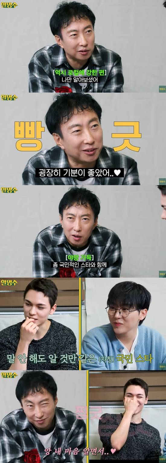 버논은 "저는 사실 뒤늦게 유튜브로 '무한도전'을 사랑하게 됐다. 승관이야말로 진짜 유년기를 (함께했다)"고 말했다. 이에 부승관이 "진짜는 저다. 얘는 뒷북이다"라고 말해 웃음을 자아냈다.