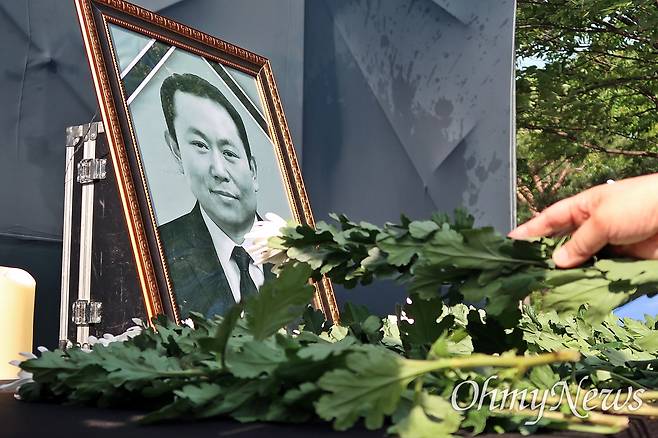 | ▲ 추모제 참석자들이 고인의 영정 앞에 헌화하고 있다. |