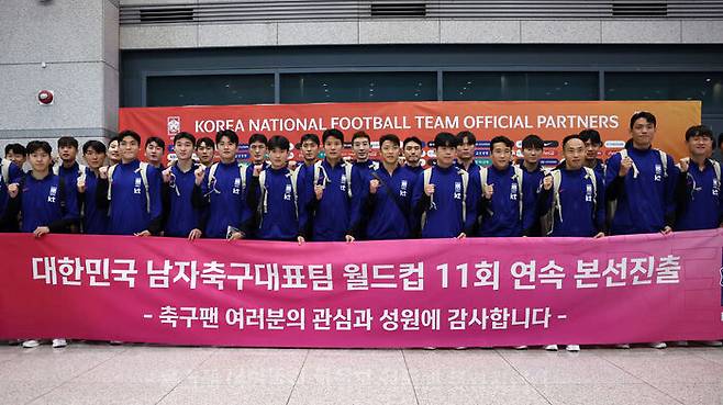 ▲ 11회 연속 월드컵 본선 진출에 성공한 대한민국 축구 대표팀이 6일 인천국제공항을 통해 귀국 후 기념촬영을 하고 있다.