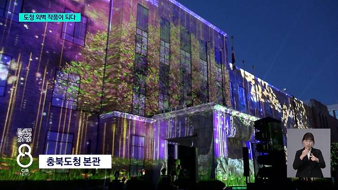 건물 벽면에 빛을 쏘아 만드는 전시 작품 '미디어파사드'가 충청북도 도청에서 펼쳐지고 있습니다.