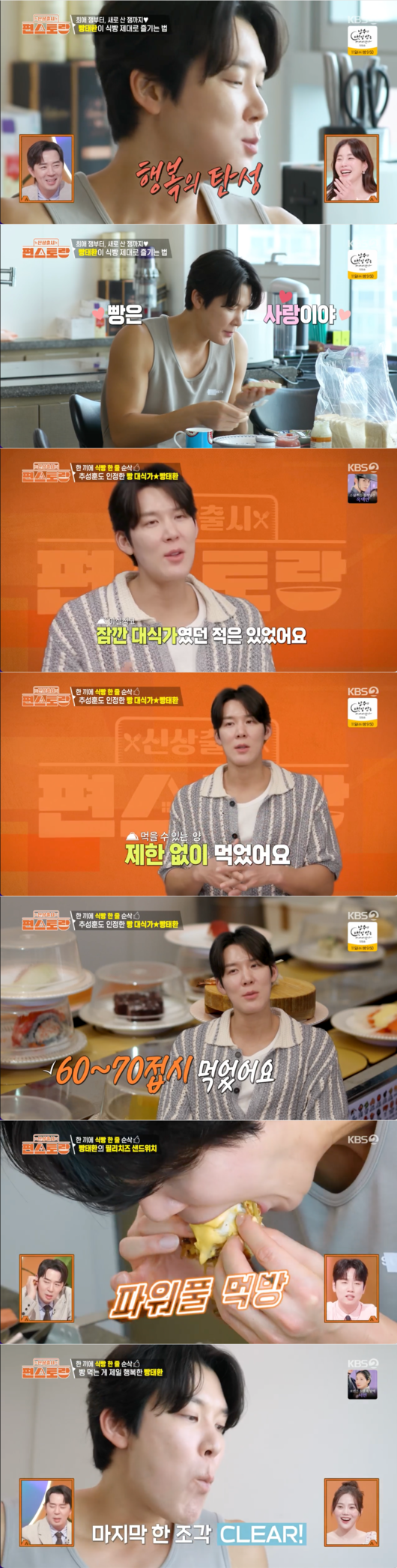계속해서 빵 먹방을 이어가는 박태환은 “행복은 멀리 있는 게 아니야. 내 눈앞에 있어. 이게 행복이지”라며 기분좋은 미소를 지었다. 본은인 대식가가 아니라는 박태환은 “대식가였던 적이 있다. 회전초밥집에서 60~70접시 먹었다”라고 밝혔다.
