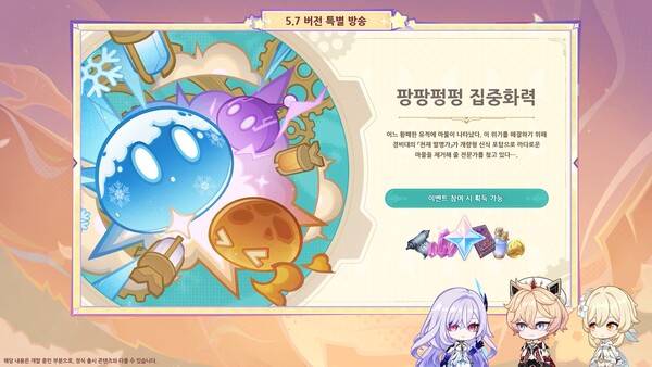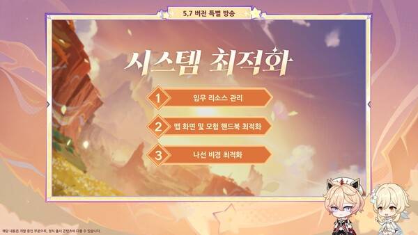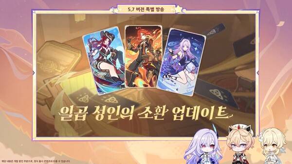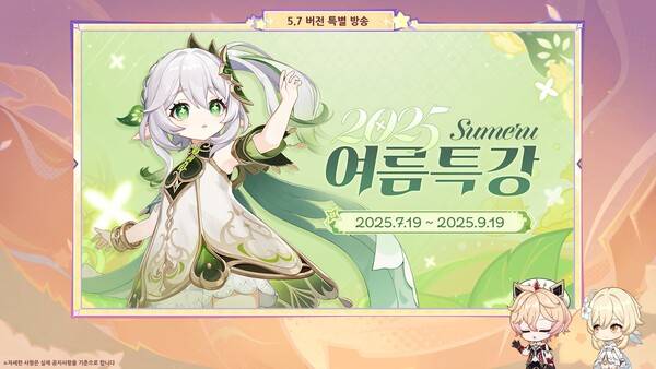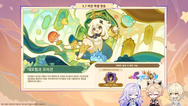 이외 원신 PC방 여름특강으로 수메르 테마가 적용되고 스커크 단편 애니메이션 주제곡을 부른 일본 가수 스즈키 아이리의 특별 메시지가 공개됐는데 6월 16일 출시될 원신 5.7 버전의 상세 내용은 아래와 같다.