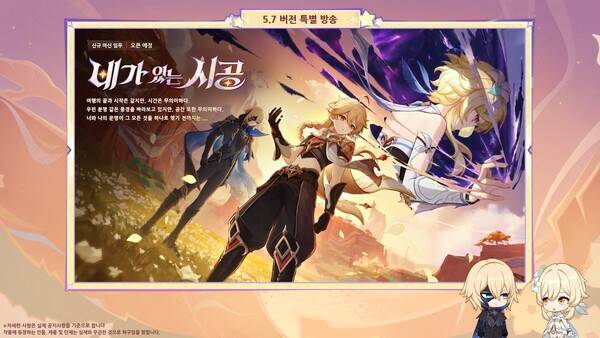 서 성우는 "5.7 버전 PV의 정보량이 엄청 많다. 버전 이름도 네가 있는 시공인 것을 보면 무언가 심상치 않다. 두 남매가 서로 다른 시공에서 서로의 마음을 이해하게 되는 것일까. 확실한 것은 여행자와 가족에 대한 아주 중요한 이야기가 찾아온다"며 기대감을 끌어올렸다.