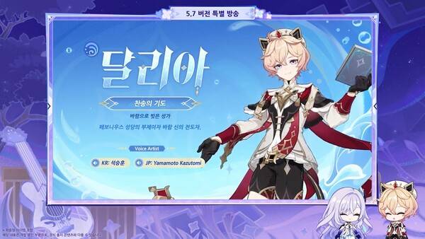 호요버스가 6일 원신 5.7 버전 '네가 있는 시공' 업데이트 소식을 전하는 특별 방송을 진행했다. 방송 진행은 달리아 역의 석승훈 성우, 스커크 역의 서다혜 성우가 맡았다.