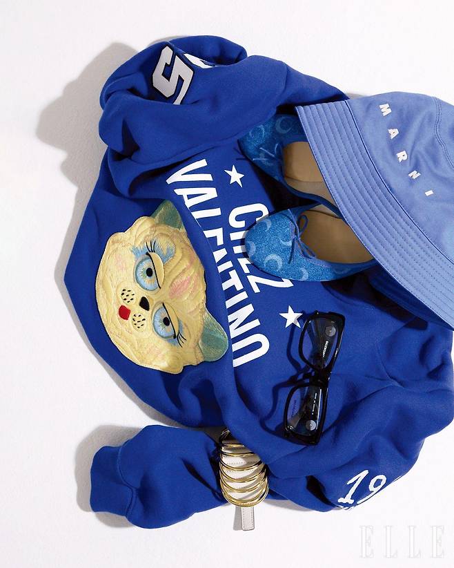 고양이를 수놓은 스웨트셔츠는 2백65만원, Valentino. 버킷 햇은 가격 미정, Marni. 레페토와 협업한 데님 플랫 슈즈는 63만8천원, Marine Serre. 볼드한 링이 달린 브레이슬릿은 1백8만원, Tod’s. 각진 프레임의 안경은 57만원, Balenciaga by Kering Eyewear.