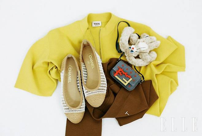 옐로 모크넥 톱은 2백4만원, 레깅스는 1백16만원, 모두 Tod’s. 나노 바게트 백은 1백만원대, Fendi. 라피아 플랫 슈즈는 가격 미정, Chanel. 토끼 키 링은 4만3천원, Inimini.