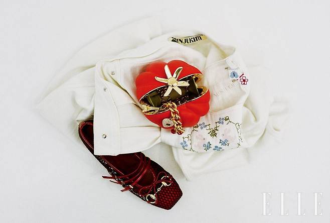 토끼를 수놓은 데님 팬츠는 65만원, Minjukim. 토마토 모티프의 백은 가격 미정, Loewe. 홀스빗 메시 플랫 슈즈는 가격 미정, Gucci. 에펠탑과 하트, 체리 참 디테일의 브레이슬릿은 2백34만원, Valentino Garavani. 나비와 꽃 모티프의 픽셀 브로치는 2만3천원, 모두 Naviverse.