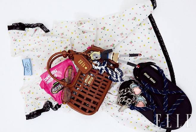 플로럴 드레스는 가격 미정, Prada. 과자 봉지 모티프의 클러치백 월렛은 가격 미정, Balenciaga. 레더 핸드백과 닻 모티프의 백 트릭, 크로셰 백 트릭, 스트랩 샌들은 가격 미정, 모두 Miu Miu. 오벌 프레임의 안경은 38만8천원, Maison Margiela × Gentle Monster. 하트 모티프의 참이 달린 브레이슬릿은 6백10만원, Valentino Garavani.