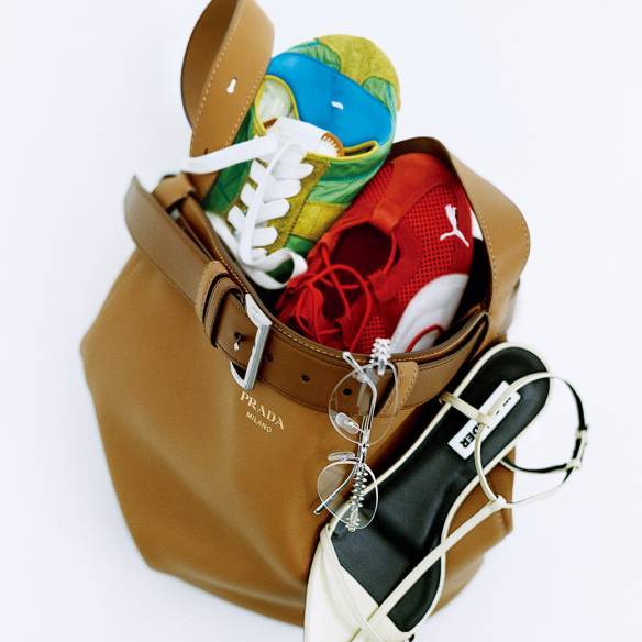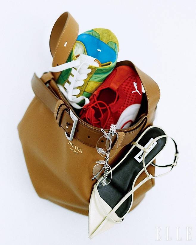 벨트 디테일의 버킷 백은 가격 미정, Prada. 멀티컬러 스니커즈는 가격 미정, Maison Margiela. 레드 스니커즈는 13만9천원, Puma. 스트랩 샌들은 가격 미정, Jil Sander. 안경은 2백33만원대, Cartier by Kering Eyewear.