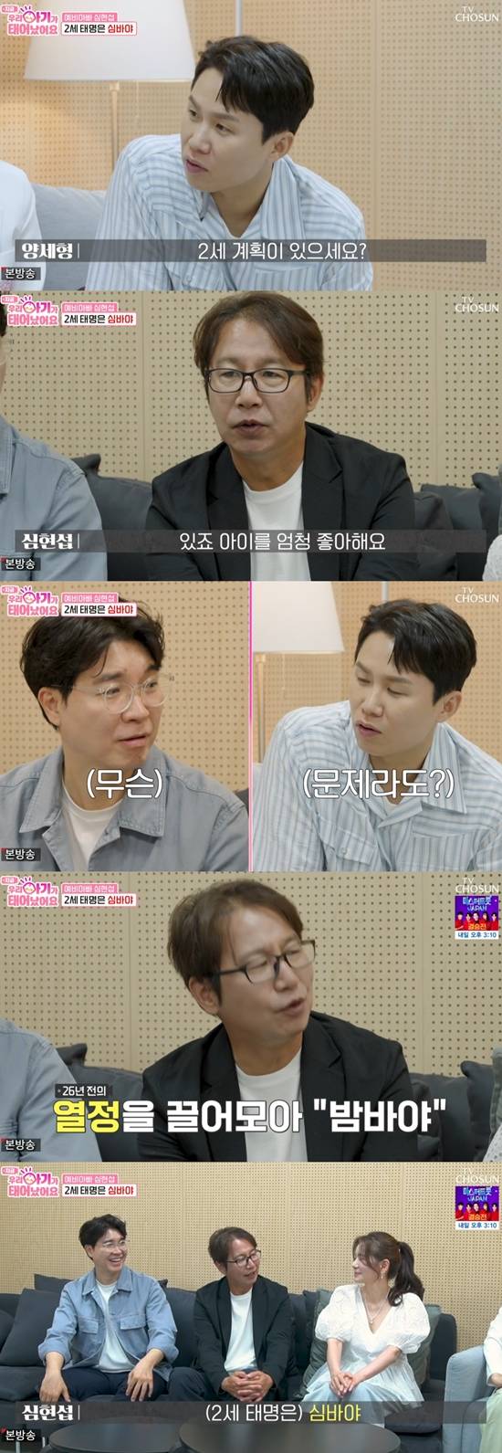 양세형은 "만약 2세가 건강하게 태어나면 기분이 어떨 것 같냐"고 심현섭에게 물었다. 심현섭은 "'개그콘서트' 첫 방송이 26년 전이다. 온갖 열정과 혼을 다해서 아이 앞에서 밤바야를 외치겠다. 태명은 심바야, 심밤바다. '라이온 킹' 이름이다. 귀엽다"라고 밝혔다.