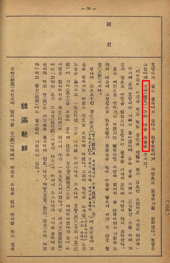 ‘곰과 호랑이가 한 동굴 속에 살면서 환웅(桓雄)께 사람으로 환생케 해 달라고 빌었더니 환웅께서 신령스러운 쑥 하나와 마늘[蒜] 20줄기를 내리시며 이것들을 먹고 100일 동안 햇빛을 보지 않으면 사람이 되리라 하였는데 호랑이는 이를 지키지 못했으나 곰은 그대로 지켜 21일 만에 웅녀(熊女)가 되었다.’