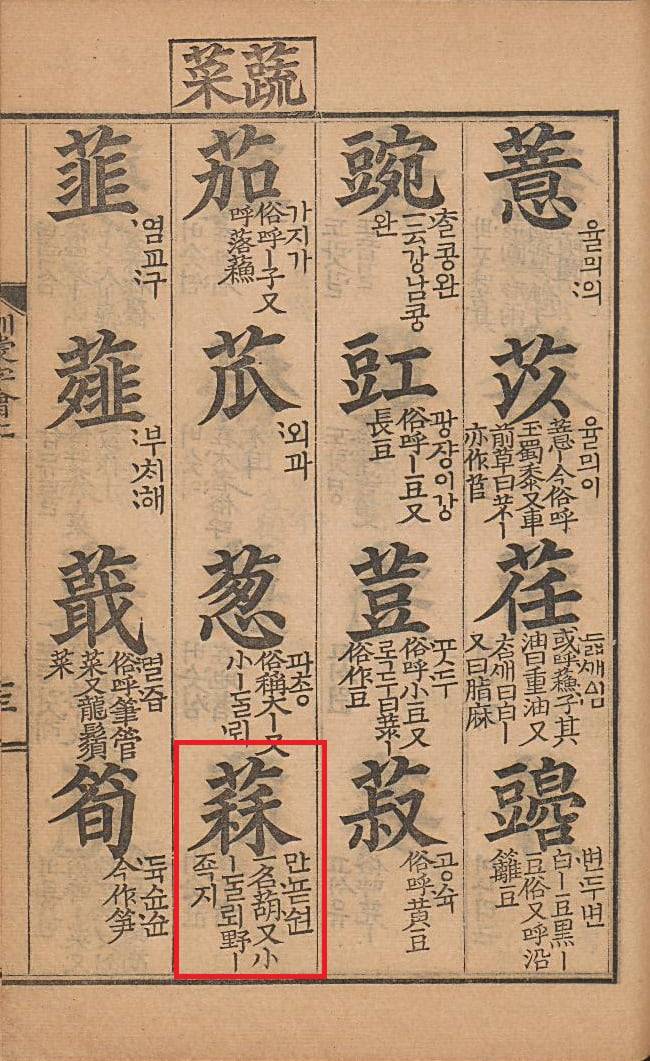 ‘향약구급방’에서 거의 100년이 지난 1527년 최세진이 편찬한 ‘훈몽자회’라는 책이 있다. ‘蒜’에 대해서 ‘마뇯 숸’, 그러니까 ‘마늘 선’이라고 풀이한다. 또 ‘일명 ‘葫’라고도 한다’고 설명한다. 그 아래에 ‘또 小蒜(又小蒜)’이라는 말이 나오고 이에 대한 설명이 이어진다. ‘달뢰’라고 적혀 있다. 그 아래에 또 뭐가 있다. ‘野蒜’(야산). 이에 대한 설명은 ‘족지’라고 적혀 있다.