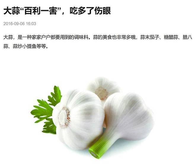 중국 속설을 몰지각하게 수용하면서 벌어진 일이다. 현대 중국 속설에 마늘을 가리켜서 ‘蒜有百利 唯有一害(산유백리 유유일해)’라고 한다. ‘100가지 이득이 있는데 오직 하나가 나쁘다’는 뜻이다. 그런데 나쁜 요소는 냄새가 아니라 ‘傷目(상목)’, 그러니까 ‘눈’에 나쁘다는 주장이다. ‘마늘을 많이 먹으면 눈에 나쁘다’라는 ‘본초강목’ 내용을 인용해 사자성어처럼 만든 문장이다. 지금도 중국 내에서는 이 주장을 두고 논쟁이 한창이다.