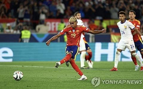 전반은 스페인이 2-0으로 앞선 상황으로 종료됐다. 그리고 후반에도 스페인의 폭격은 멈추지 않았다. 후반 9분 스페인이 페널티 킥을 얻었다. 이를 야말이 왼발로 오른쪽 아래로 슈팅해 팀의 세 번째 득점을 신고했다.