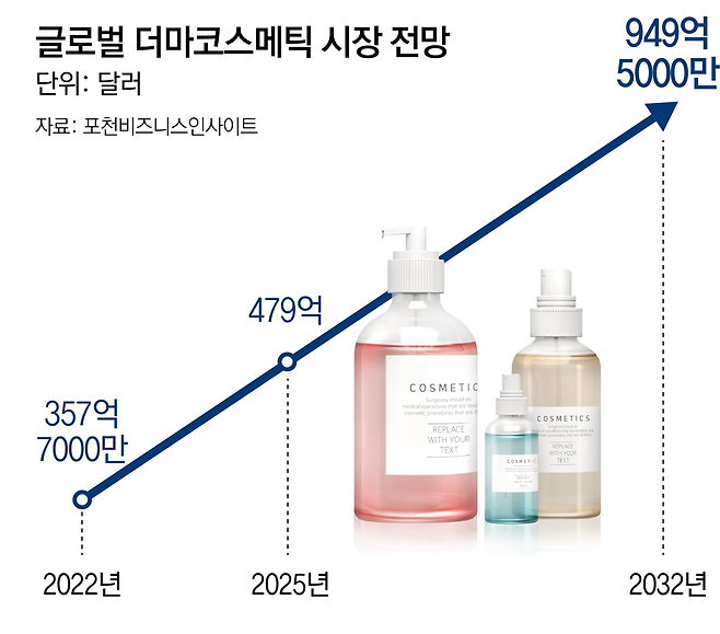 시장조사기관 포천비즈니스인사이트에 따르면 국내 더마코스메틱 시장 규모는 2017년 5000억 원에서 2022년 4조5325억 원까지 빠르게 성장했다. 글로벌 시장 규모는 2022년 357억7000만 달러(약 49조1500억 원)에서 2025년 479억 달러, 2032년 949억5000만 달러까지 성장할 것으로 전망된다.