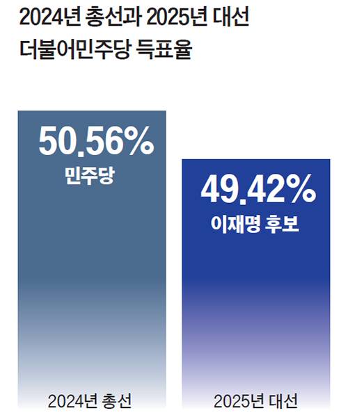 ▶신정섭=“6·3 대선의 관전 포인트는 두 가지였다. 첫째 이재명 더불어민주당 후보가 과반을 가져갈 것인가, 둘째 양당에 대한 비호감이 높은 상황에서 이준석 개혁신당 후보가 약진해 10%를 넘을 것인가였다. 둘 다 예상과 다르게 흘러갔다. 이재명 대통령은 50%를 넘기지 못했다. 역대 최다 득표라고 하지만 득표율만 보면 지난해 총선에서 민주당 지역구 득표율(50.56%)보다 낮았다. 제3세력도 실망스러운 성적을 남겼다. 이준석 후보는 10%를 넘기지 못했고, 권영국 민주노동당 후보는 1%가 채 안 되는 역대 최저 득표율을 기록했다. 박근혜 전 대통령 탄핵 직후 치른 19대 대선에선 심상정 정의당 후보가 6.17%까지 얻었다. 여러 요인이 있겠지만, 하나를 들자면 사표 방지 심리다. 승자 독식 구조인 한국 대선 특성상 ‘상대방이 집권하면 안 된다’는 심리가 강하게 작용, 제3정당으로 향했던 표심을 억제했을 것으로 보인다.”
