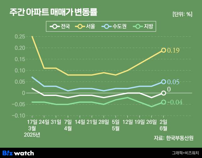 한국부동산원은 6월 첫째 주(2일 기준) 서울 주간 아파트 매매가격이 전주 대비 0.19% 올랐다고 분석했어요. 한 주 전 상승률(0.16%)과 비교하면 0.03%포인트 높아진 거고요.
