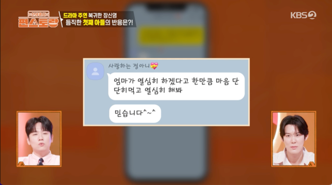 오랜만의 복귀를 앞두고 긴장한 탓인지 아팠다는 장신영은 응급실을 다녀왔다고 전하기도. 아들에게 이 소식을 알리자 ‘엄마가 열심히 하겠다고 한만큼 마음 단단히 먹고 열심히 해봐. 믿습니다’라는 톡을 받았다고 덧붙였다.