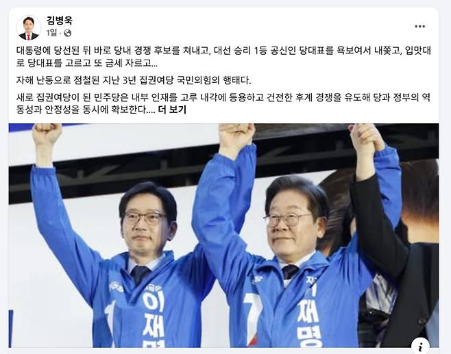 이 대통령이 더불어민주당 대선 경선 당시 경쟁자였던 김경수 전 경남도지사를 행정안전부 장관으로 검토 중인 것으로 알려지자 김병욱 전 의원은 5일 자신의 페이스북에 "만약 3년 전 우리가 홍준표 국무총리, 유승민 경제부총리, 이준석 당대표 체제로 당과 정부를 운영했다면 어땠을까"라고 목소리를 높였다. 이어 그는 과거 윤석열 전 대통령과 이준석 개혁신당 의원(당시 국민의힘 당 대표)의 내홍 사태를 언급하며 국민의힘의 대선 패배 원인에 대해 짚었다.