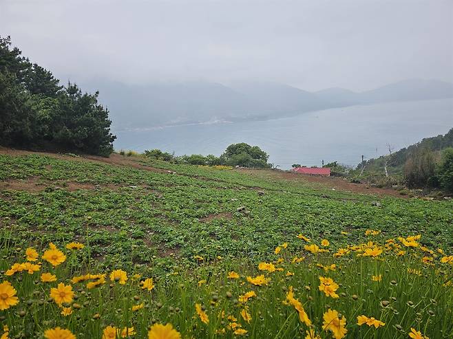 | ▲ 봉통마을 입구 방풍나물밭. 바다 건너 금오도가 보인다. |