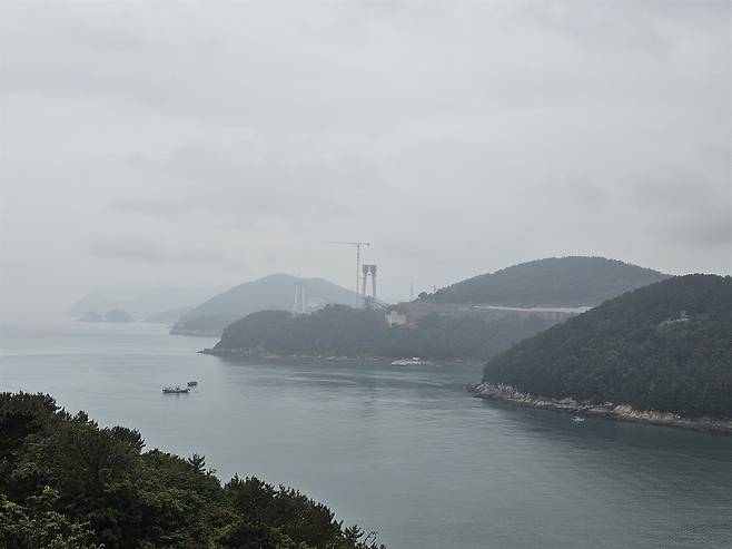 | ▲ 대두라도에서 바라본 월호도(왼쪽)와 화태도(오른쪽). 가운데 바다 사이로 연도교 건설 기초공사가 한창이다. |