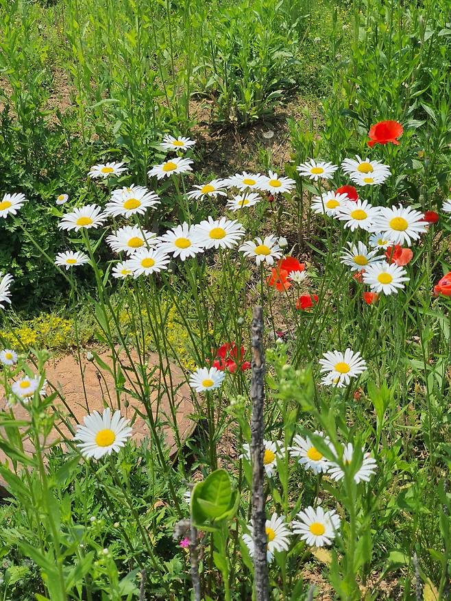 | ▲ 샤스타데이지와 우미인화(꽃양귀비) 낮곁에 산책하다가 본 샤스타데이지와 우미인화(꽃양귀비). 샤스타데이지는 구절초와 많이 닮았지만 봄에 꽃이 피고, 구절초는 가을에 핍니다. 관화미심(觀花美心)-꽃을 보면 마음을 아름답게 하라. 내란의 골짜기를 지나는 동안 우리 공동체 모두가 상처를 받았고, 슬픔을 맛보았습니다. 이제는 꽃도 보고 시도 읽으면서 마음을 차분히 정화할 시간입니다. |