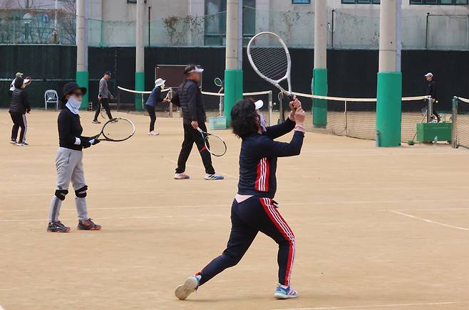 | ▲ 3월 13일 오전 부산 해운대구 신시가지 내 한 테니스장에서 동호인들이 운동하고 있다. |
