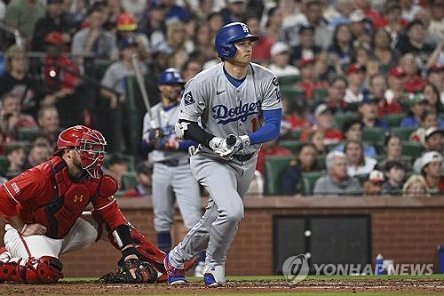 Los Angeles Dodgers' Shohei Ohtani, right, watches his single next to St. Louis Cardinals catcher Pedro Pages, left, in the third inning of a baseball game, Friday, June 6, 2025, in St. Louis. (AP Photo/Joe Puetz)