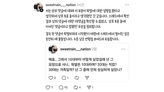 그러면서 "저는 상위 댓글에 학벌에 대해 설명하고 상호 토론 중이라고 생각했던 것 같다"며 "확인 결과 상위 댓글에 대한 대댓글을 확인할 수 없었고, 상호 토론 중에 이어진 (비하 발언을 한) 댓글이라고 말한 주장을 철회한다"고 덧붙였습니다.
