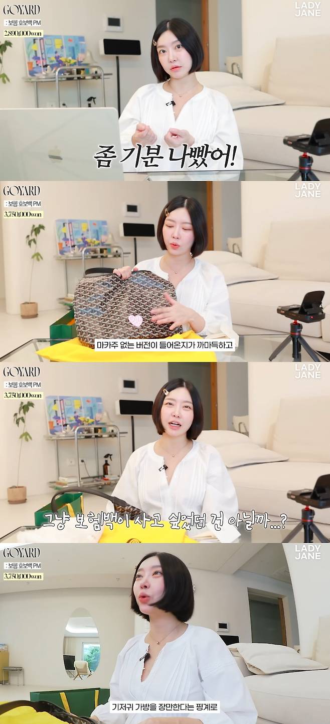 또한 레이디제인은 마음에 들어 했던 가방을 언급하며 "기본 버전이 289만원이다. 근데 마카주라고 해서 마킹이 되어있는 게 있는데 난 하고 싶지 않았지만 기본은 없고 마카주가 되어있는 디자인만 팔더라. 말하자면 강매"라며 "고야드백을 사고 싶다면 이걸 사야 하는데 마카주만 46만 원이다. 마카주 들어가면 가방이 335만 원인데 난 원치도 않는데 그림을 넣어놓고 파는 거다"라고 토로했다.
