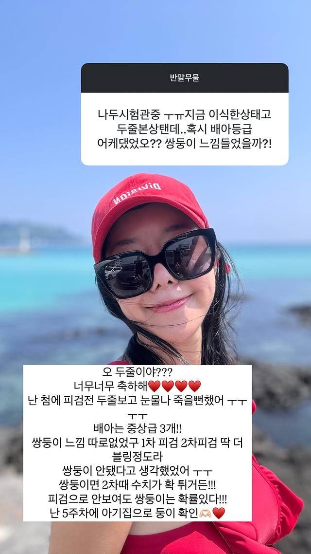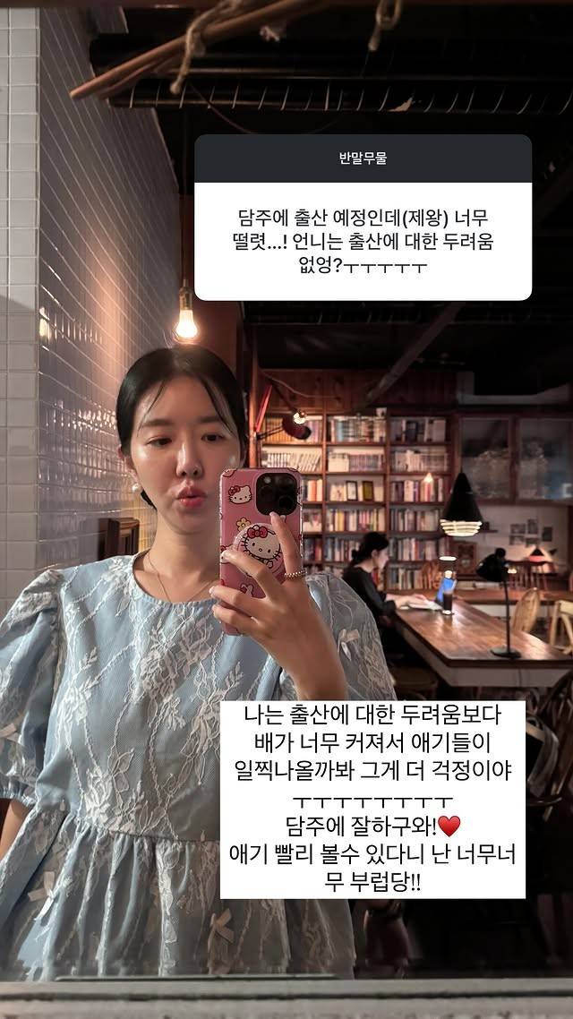 출산에 대한 두려움을 묻자 "나는 출산에 대한 두려움보다 배가 너무 커져서 애기들이 일찍 나올까봐 그게 더 걱정이야. 담주에 잘하고 와! 애기 빨리 볼 수 있다니 난 너무 너무 부럽당!!"이라고 답했다.