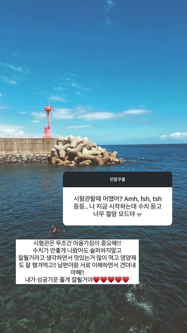 또 시험관 시술을 시작한다는 누리꾼에게는 "시험관은 무조건 마음가짐이 중요해!!! 수치가 안 좋게 나왔어도 슬퍼하지 말고 잘 될 거라고 생각하면서 맛있는 거 많이 먹고 영양제도 잘 챙겨먹고!! 남편이랑 서로 이해하면서 견뎌내야 해!! 내가 성공 기운 줄게 잘 될 거야"라며 응원했다.