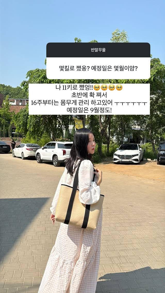 그런가 하면 "나 11kg 쪘어. 초반에 확 쪄서 16주부터 몸무게 관리하고 있어. 예정일은 9월 정도"라며 체중 증량 사실을 밝히기도 했다.