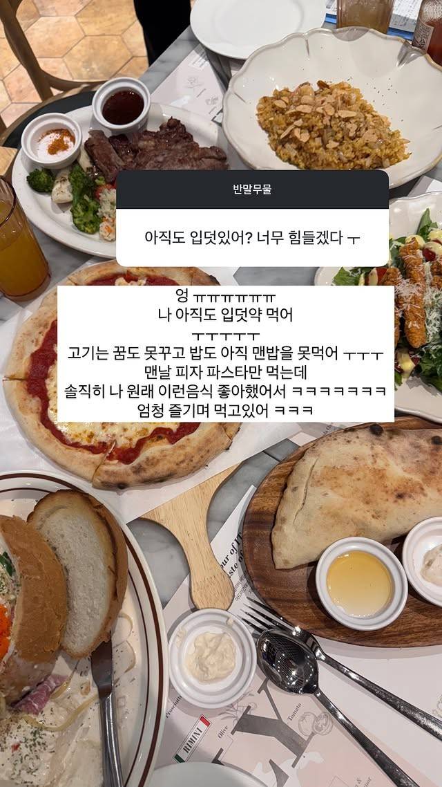 김지혜는 "아직도 입덧이 있냐"는 물음에 "나 아직도 입덧약 먹어. 고기는 꿈도 못 꾸고 밥도 아직 맨밥을 못 먹어. 맨날 피자 파스타만 먹는데 솔직히 나 원래 이런 음식 좋아했어서 엄청 즐기며 먹고 있어"라며 너스레를 떨었다.