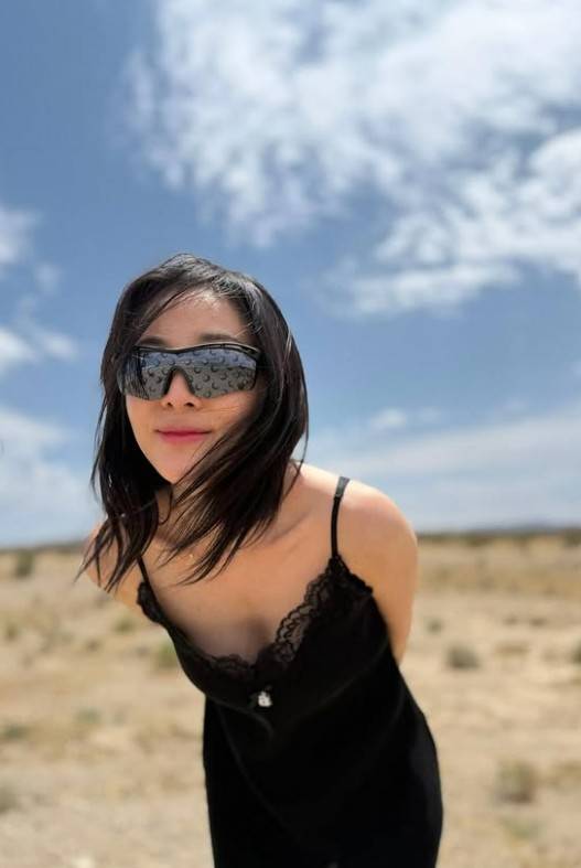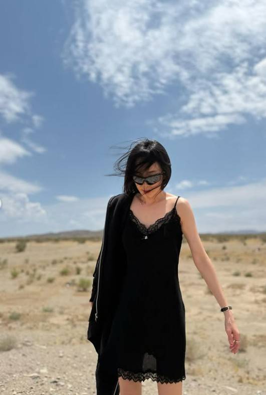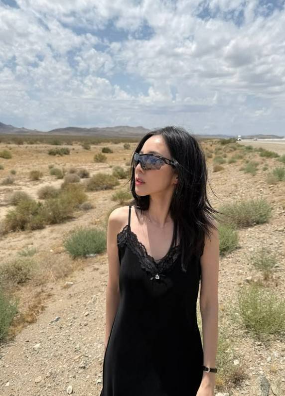 산다라박은 최근 자신의 인스타그램에 "베가스 가던길"이라는 짧은 글과 함께 미국 사막을 배경으로 한 사진 여러 장을 공개했다. 사진 속 그는 레이스 포인트가 돋보이는 블랙 슬립 드레스에 미러 선글라스를 매치해 감각적인 올블랙 스타일링을 완성했다.