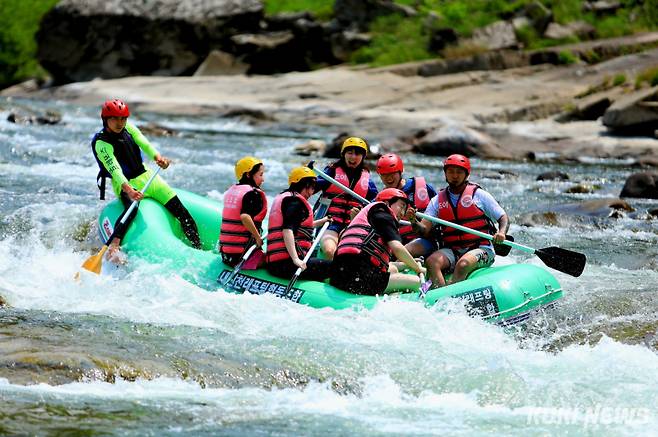 낮 최고 30도의 초여름 날씨를 보이는 7일 오후 강원 인제군 내린천에는 래프팅을 즐기려는 마니아들로 북적였다.(인제군 제공)