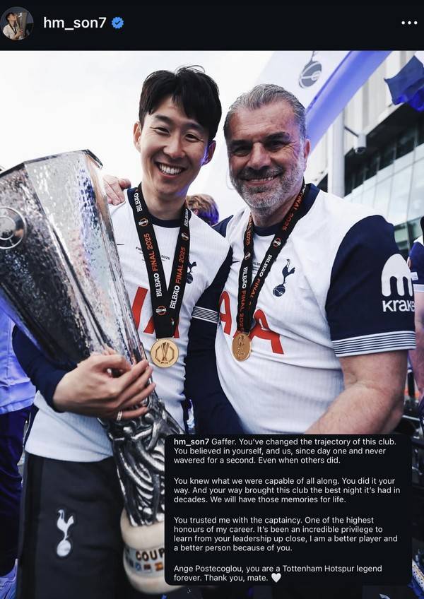 손흥민이 그토록 갈망하던 우승컵을 안긴 장본인도 포스테코글루 감독이다. 손흥민은 포스테코글루 감독 덕분에 주장으로서 가장 먼저 유로파리그 트로피를 들어올리는 영광의 순간을 맞았다. 해리 케인을 비롯한 모든 동료들이 떠나는 와중에도 꿋꿋이 토트넘을 지켰던 손흥민에게는 최고의 선물이었다. 그렇기에 손흥민은 자신의 SNS에 포스테코글루 감독에 대한 애정이 담긴 작별인사를 남겼다.