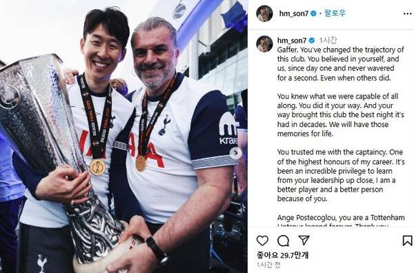 이어 "마침내 자신만의 방식으로 해냈다. 토트넘에서 수십 년 만에 찾아온 가장 위대한 밤을 선사했다. 우리는 그 순간을 평생 기억할 것이다. 내게 주장 완장을 맡긴 것은 내 커리어에서 가장 큰 영예 중 하나였다. 감독님의 리더십을 가까이에서 지켜보며 배울 수 있었던 것은 정말 말로 다 할 수 없는 특권이었고, 당신 덕분에 나는 더 나은 선수이자, 사람이 될 수 있었다. 포스테코글루 감독님 당신은 토트넘 홋스퍼의 영원한 레전드다. 정말 감사드린다"고 감사함을 전했다.