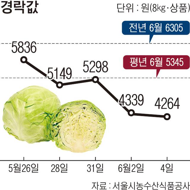 4일 서울 가락시장에서 양배추는 8㎏들이 상품 한망당 4264원에 거래됐다. 지난해 6월 평균(6305원)보다 32.4%, 평년 6월(5345원) 대비해선 20.2% 낮다.