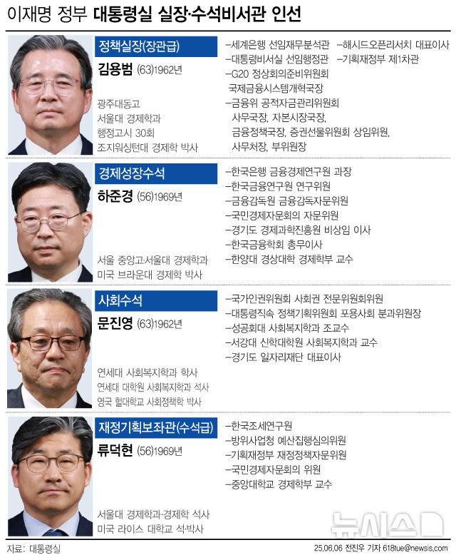 [서울=뉴시스] 6일 대통령실은 이재명 대통령이 새 정부 첫 정책실장(장관급)으로 김용범 전 기획재정부 1차관을 임명한 것을 비롯해 경제성장수석에 하준경 한양대 교수, 사회수석에 문진영 서강대 교수, 재정기획보좌관(수석급)에 류덕현 중앙대 교수를 임명했다고 밝혔다. (그래픽=전진우 기자)
