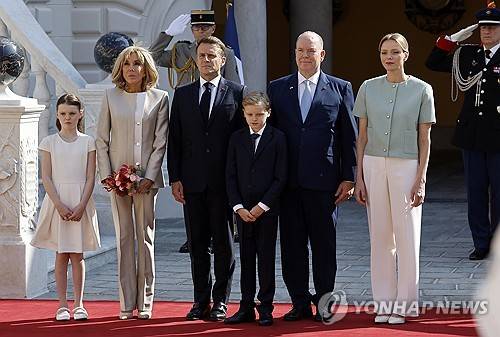 epa12162502 French President Emmanuel Macron (3-L) and his wife Brigitte Macron (2-L) stand with Prince Albert II of Monaco (2-R), Princess Charlene (R) and their children Gabriella (L) and Jacques (3- R) during a welcoming ceremony upon their arrival for a two-day state visit ahead of the UNOC meeting, at the Prince's Palace in Monaco, 07 June 2025. The EU will present the new roadmap at the 9-13 June UN Ocean Conference (UNOC), which is set to draw some 70 heads of state and government to southern France. EPA/SEBASTIEN NOGIER
