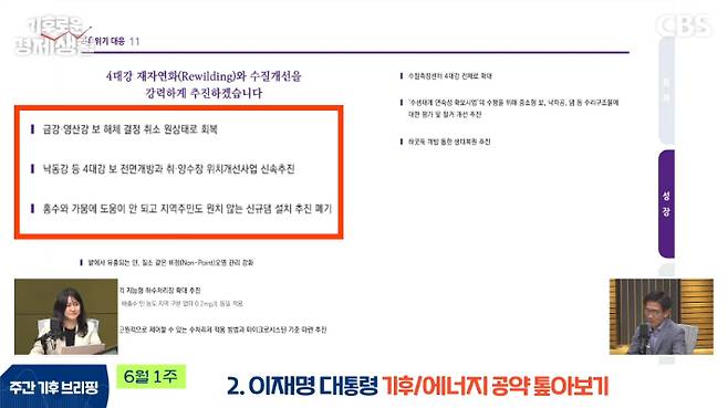 ◇ 최서윤> 한번 시끄럽지 않을까 싶어요. 특히 문재인 정부 때 금강과 영산강 보 해체를 결정했는데 윤석열 정부에서 취소했잖아요. 이걸 다시 취소해서 원상회복한다고 했어요. 그러면 보 해체가 이루어질지 주목이 되고요. 그다음에 이런 공약이 있었어요. 홍수와 가뭄에 도움이 안 되고 지역 주민도 원치 않는 신규 댐 설치 추진을 폐기한다고 밝혔는데 윤석열 정부에서 추진한 기후 대응 댐 계획 백지화하겠다는 의미로 보입니다.